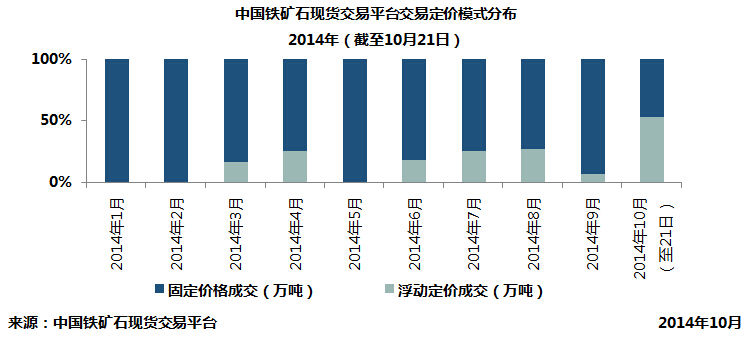 定價模式方面,2014年來平臺浮動定價交易數量顯著攀升,截至10月21日共成交226萬噸,占總成交量23.1%,固定價格成交752.64萬噸,占比為76.9%。結合年內鐵礦石價格走勢分析,3月、8月和10月等價格波動較大的月份中,浮動定價交易占比較大。
