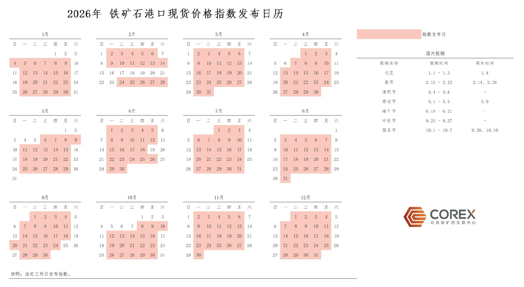 2026年鐵礦石港口現貨價格指數發布日歷