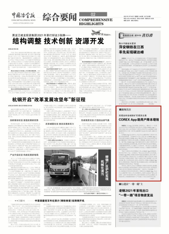 編者按:3月18日,《中國(guó)冶金報(bào)》二版以《實(shí)現(xiàn)全時(shí)全域鐵礦石現(xiàn)貨交易COREX App助用戶降本增效》為題,對(duì)用戶通過(guò)我公司COREX App達(dá)成便捷、高效交易,實(shí)現(xiàn)降本增效進(jìn)行了重點(diǎn)報(bào)道。
