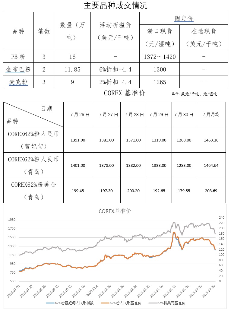 7月26日-7月30日成交11筆共46.65萬(wàn)噸,其中在途1筆17萬(wàn)噸,港口10筆29.65萬(wàn)噸。