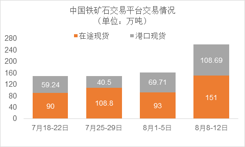 8月8日-8月12日成交120筆共259.69萬噸,其中在途10筆共151萬噸,港口110筆共108.69萬噸。主要成交品種包括:PB粉27筆共119.95萬噸,麥克粉13筆共34.19萬噸,金布巴粉18筆共22.74萬噸,FMG混合粉9筆共10.41萬噸,FMG超特粉5筆共8.2萬噸,BRBF 1筆共17萬噸。
