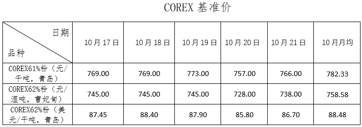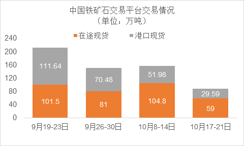10月17日~10月21日成交30筆共88.59萬噸,其中在途5筆共59萬噸,港口25筆共29.59萬噸。主要成交品種包括: PB粉7筆共41.24萬噸,麥克粉5筆共12.45萬噸,卡拉加斯粉3筆共16萬噸,金布巴混合粉4筆共12.4萬噸。