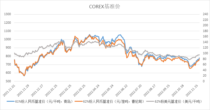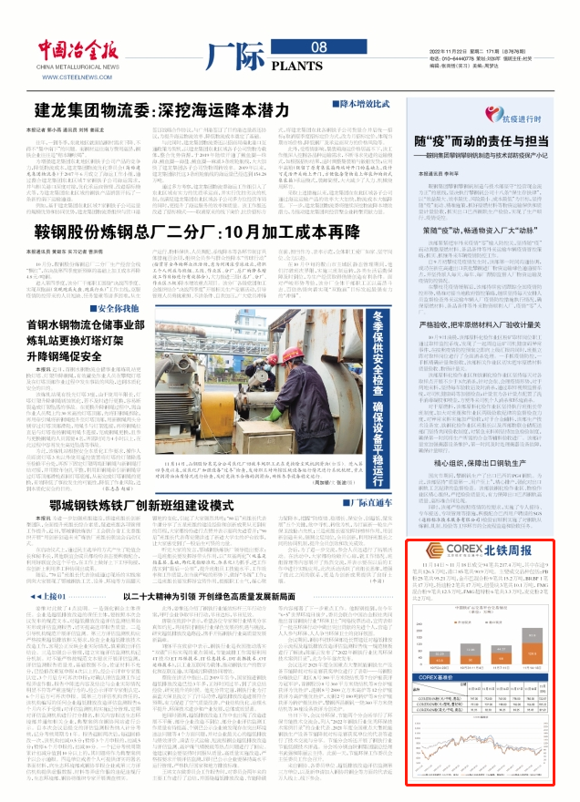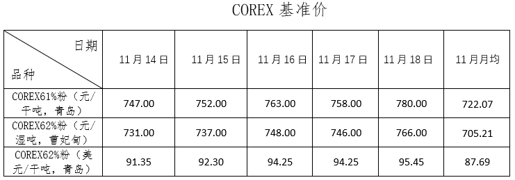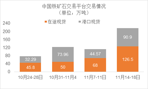 11月14日~11月18日成交94筆共217.4萬噸,其中在途9筆共126.5萬噸,港口85筆共90.9萬噸。主要成交品種包括:PB粉25筆共95.21萬噸,麥克粉2筆共2萬噸,金布巴混合粉9筆共15.2萬噸,紐曼塊3筆共10.1萬噸,揚迪粉2筆共17萬噸,BRBF 1筆共17萬噸,F(xiàn)MG混合粉9筆共12.5萬噸,F(xiàn)MG超特粉6筆共3.3萬噸。