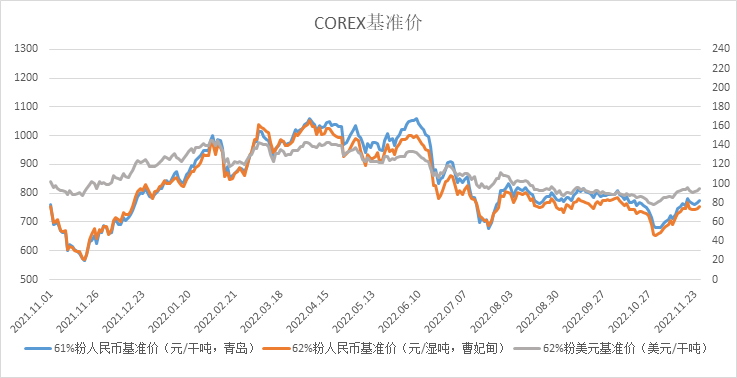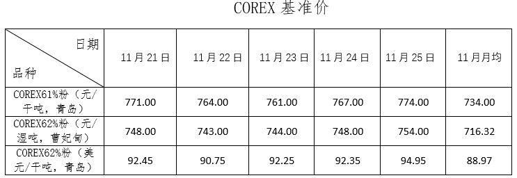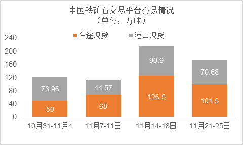 11月21日~11月25日成交71筆共172.18萬噸,其中在途8筆共101.5萬噸,港口63筆共70.68萬噸。主要成交品種包括:PB粉16筆共60.2萬噸,金布巴混合粉15筆共29.5萬噸,BRBF 3筆共20萬噸,揚迪粉1筆共9萬噸,麥克粉4筆共3.6萬噸,紐曼塊2筆共9.85萬噸,卡粉2筆共2.1萬噸, FMG混合粉3筆共2.5萬噸,FMG超特粉3筆共3萬噸。