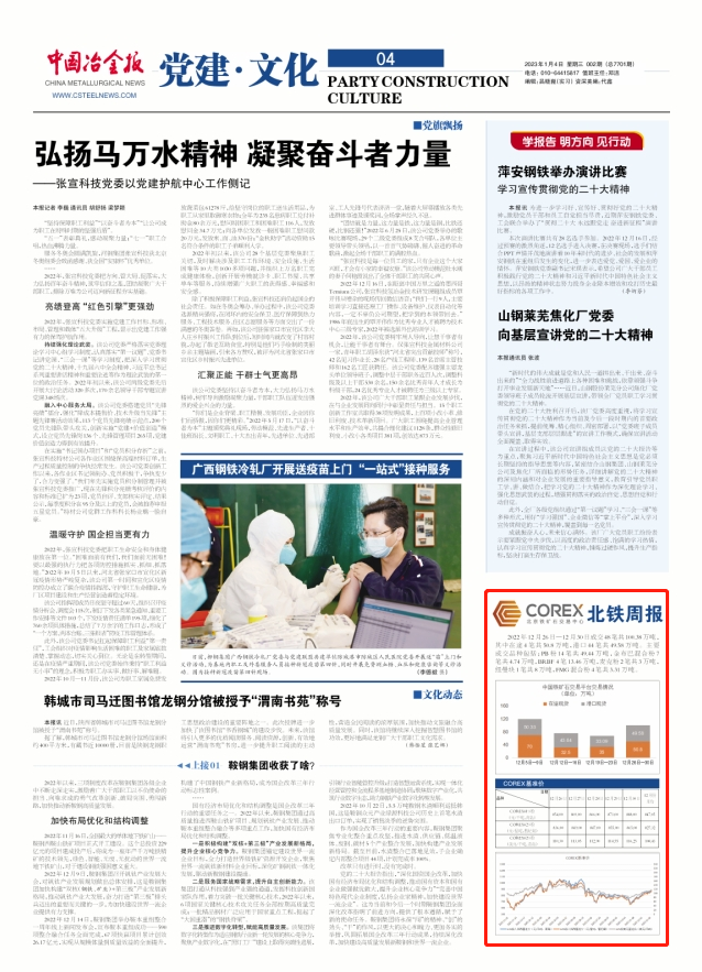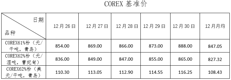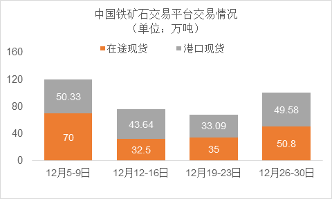 12月26日~12月30日成交48筆共100.38萬噸,其中在途4筆共50.8萬噸,港口44筆共49.58萬噸。主要成交品種包括:PB粉14筆共49.44萬噸,金布巴混合粉7筆共4.74萬噸,BRBF 4筆13.46萬噸,麥克粉2筆共3萬噸,紐曼塊1筆共8萬噸,F(xiàn)MG混合粉4筆共3.31萬噸。