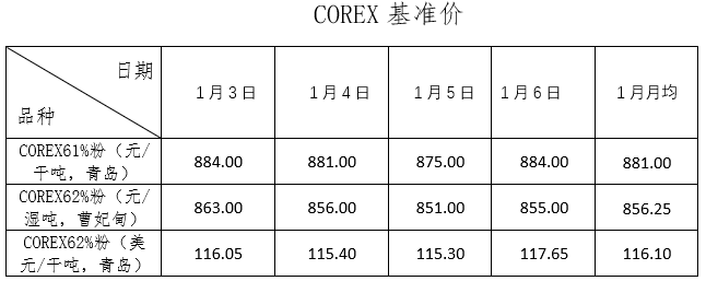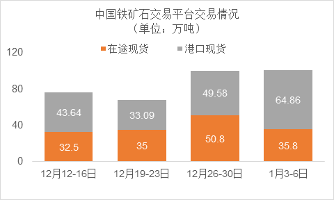 1月3日~1月6日成交62筆共100.66萬噸,其中在途2筆共35.8萬噸,港口60筆共64.86萬噸。主要成交品種包括:PB粉16筆共33.1萬噸,金布巴混合粉5筆共5.06萬噸,麥克粉5筆共6.2萬噸,紐曼粉3筆共3.2萬噸,FMG混合粉10筆共29.5萬噸,FMG超特粉6筆共7萬噸。