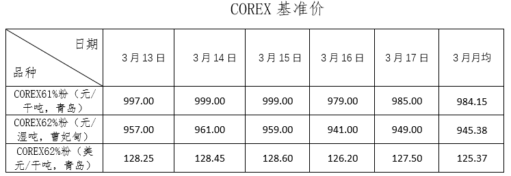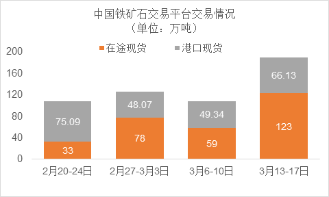 3月13日~3月17日成交75筆共189.13萬噸,其中在途12筆共123萬噸,港口63筆共66.13萬噸。主要成交品種包括:PB粉18筆共56.54萬噸,金布巴混合粉8筆共9.6萬噸,麥克粉5筆共19.5萬噸,揚迪粉4筆共11萬噸,BRBF 1筆共17萬噸,卡拉加斯粉3筆2.5萬噸,FMG混合粉3筆共1.5萬噸,FMG超特粉4筆共4.5萬噸。