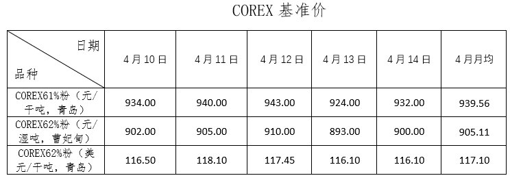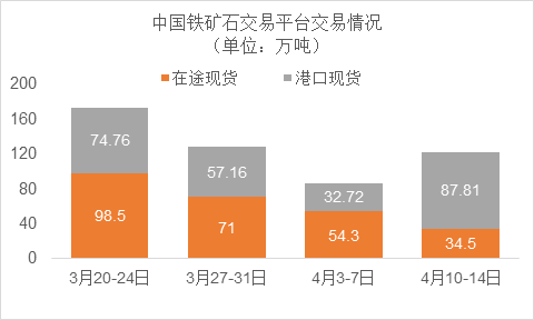 4月10日~4月14日成交72筆共122.31萬噸,其中在途5筆共34.5萬噸,港口67筆共87.81萬噸。主要成交品種包括:PB粉13筆共14.59萬噸,金布巴混合粉2筆共10.6萬噸,麥克粉4筆共5.79萬噸,揚迪粉1筆共3萬噸,卡拉加斯粉6筆12.9萬噸,FMG超特粉3筆共3.1萬噸,FMG混合粉9筆共8萬噸。